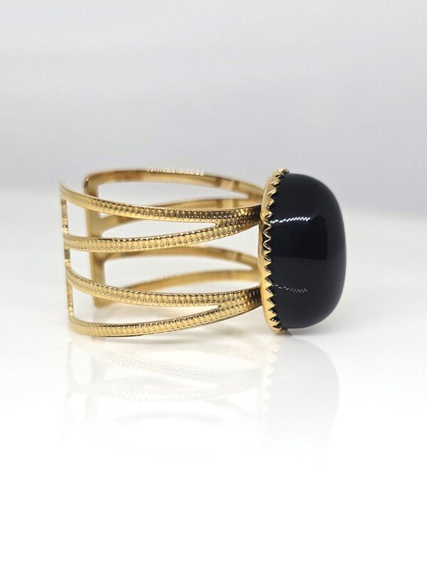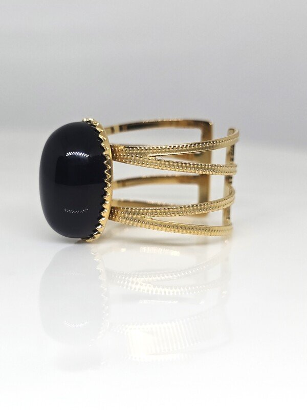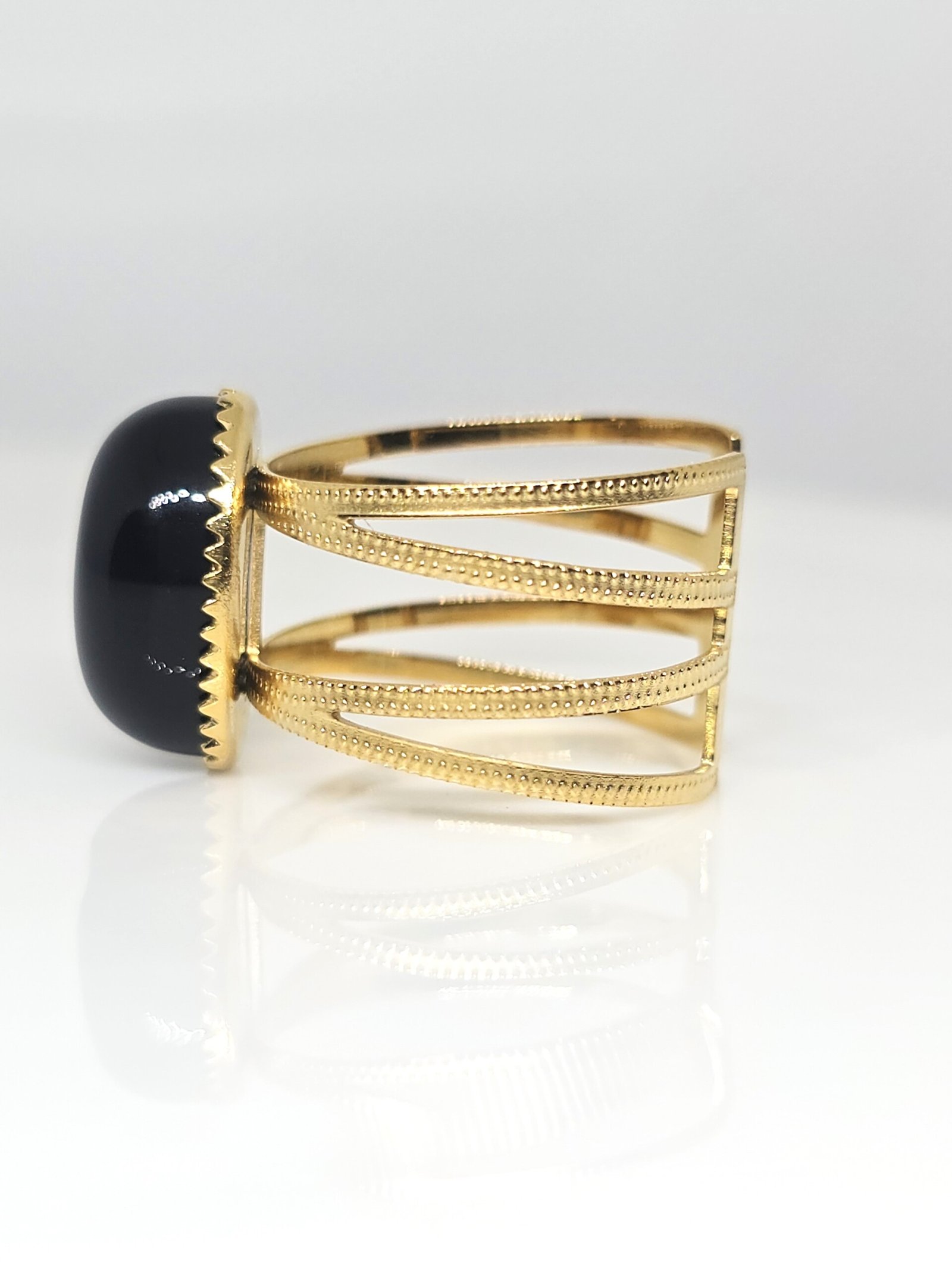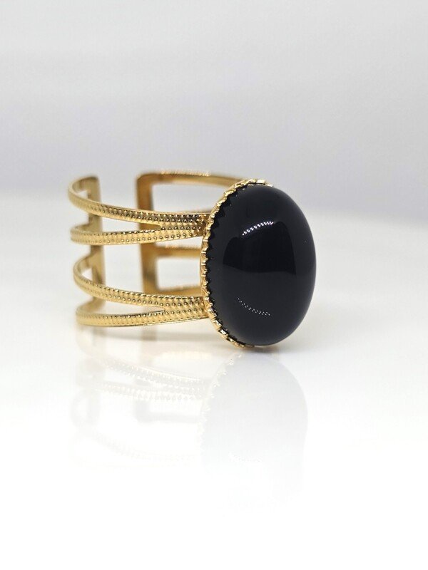 Sublimez votre style avec la bague ROSALIE. Ce modèle unique en acier inoxydable doré est orné d’une pierre naturelle d’Onyx noir, symbole de force intérieure et de protection. Sa monture fine à 4 rangs martelés, d’une largeur de 15 mm, s’ajuste facilement (taille 52 à 61) pour un confort optimal et une touche de raffinement.