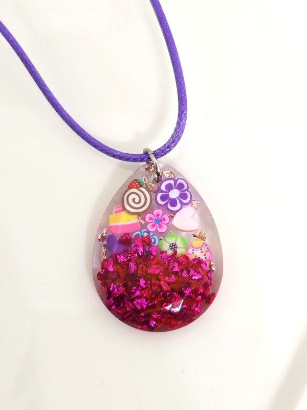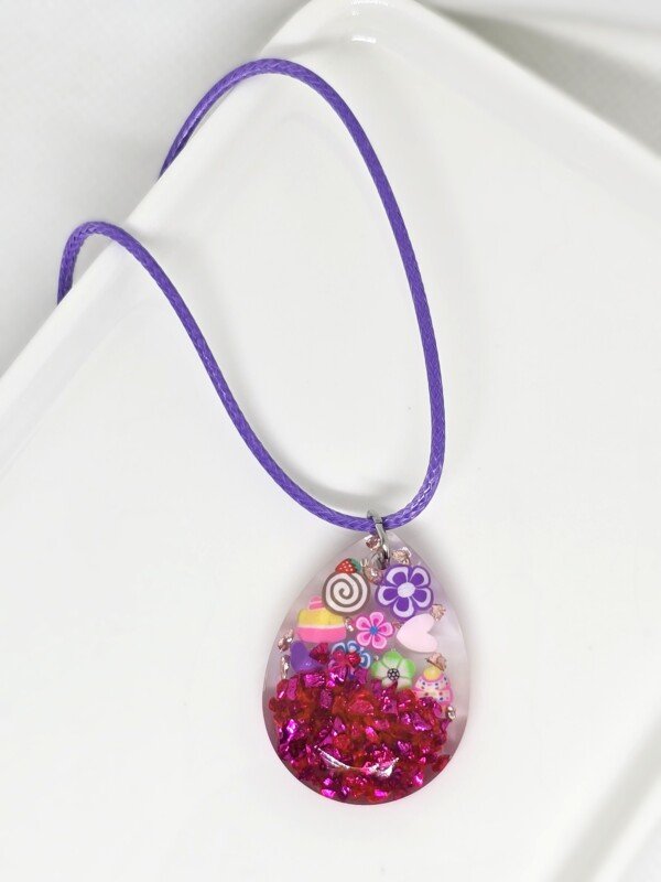 Pendentif en forme de joli médaillon en forme de goutte. En résine, réalisé à la main, renfermant de la fête et de la gourmandise ! Collier monté sur un cordon en polyester ciré violet. Un pendentif porte-bonheur qui célèbre la joie, la couleur et l’enfance.