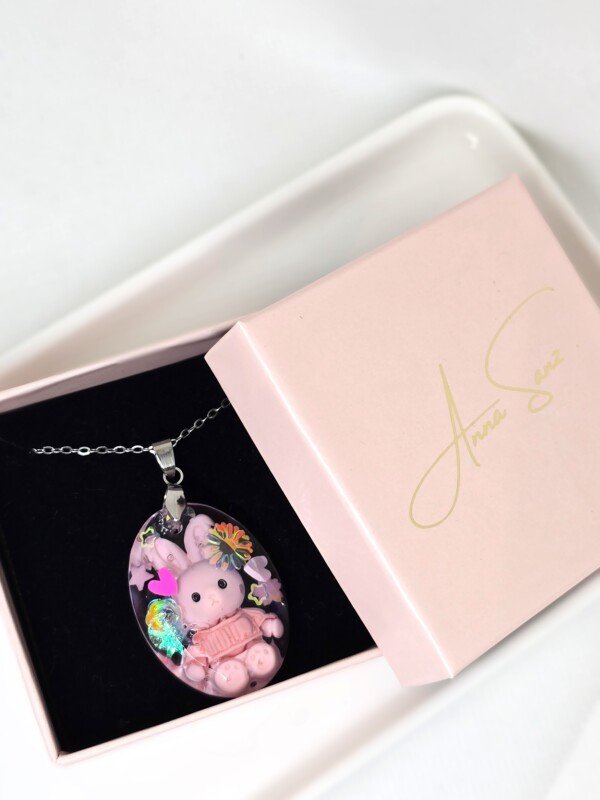 Douceur, féérie et espièglerie se rencontrent dans Lapin Câlin, un pendentif ovale en résine qui vous transporte dans un monde plein de tendresse.