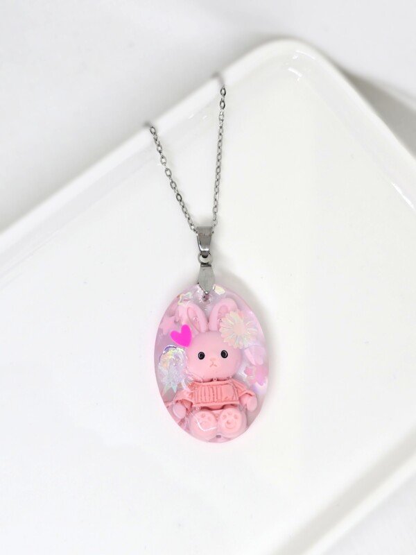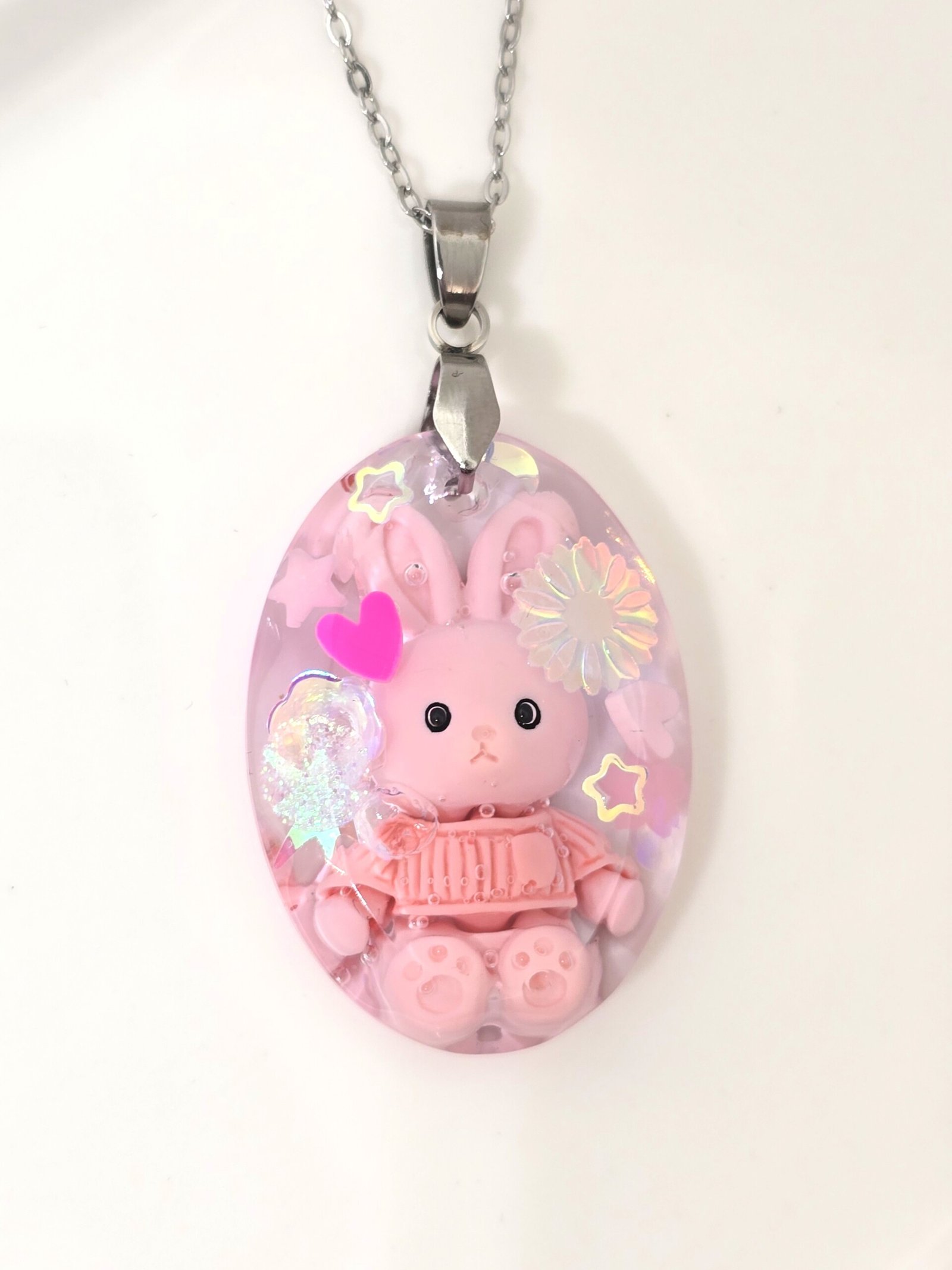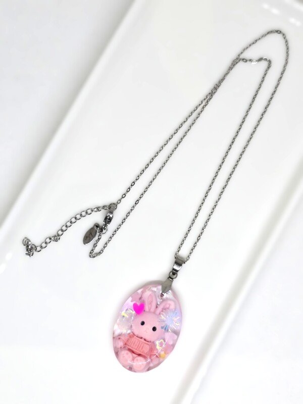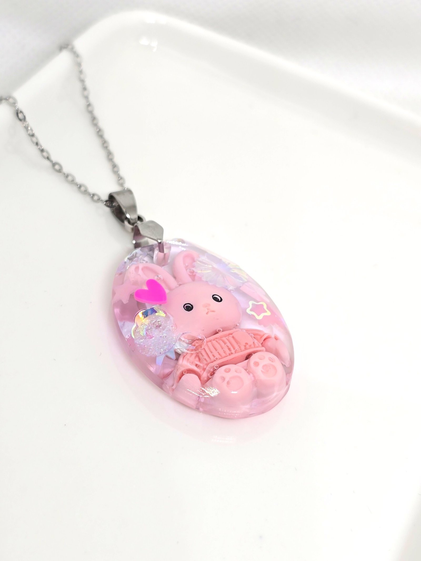 Pendentif en forme de joli médaillon en forme de goutte. En résine, réalisé à la main, un adorable lapin rose poudré se promène parmi des cœurs, des étoiles et des éléments brillants aux reflets scintillants ! Collier monté sur une chaine en acier inoxydable argenté. Un pendentif porte-bonheur qui console et rassure, comme un câlin.