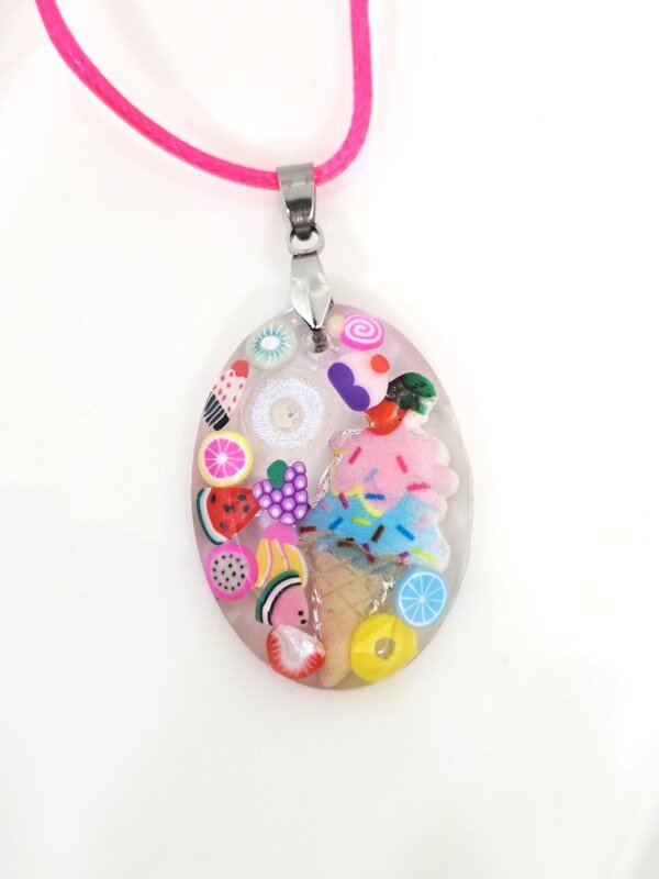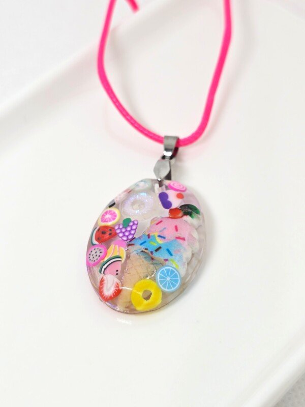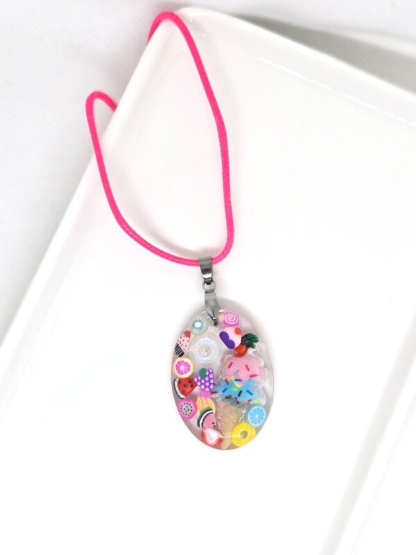 Ce collier ovale en résine transparente est rempli de fruits frais d’été, de petites glaces et de gâteaux, avec un donuts qui brille pour une touche magique ✨🍩